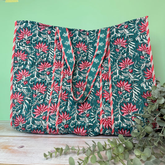 Quilted Really Useful Pouch (Green with Pink Flowers & Striped Lining)