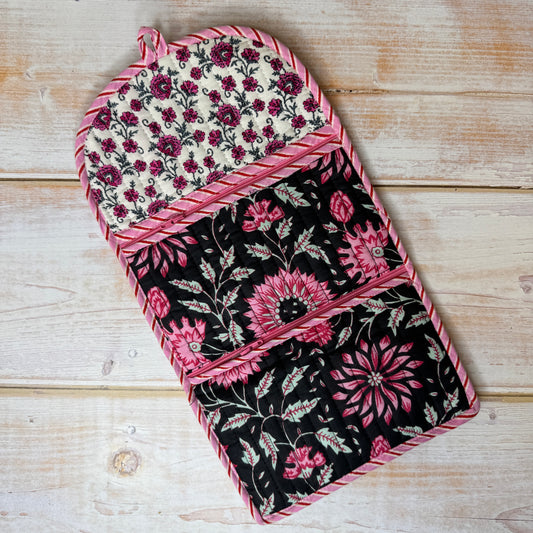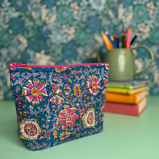 Quilted Really Useful Pouch (Blue with Pink Flowers & Pink Lining)