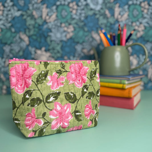 Quilted Everyday Zipped Pouch (Light Green with Pink Flowers & Pink Floral Lining)
