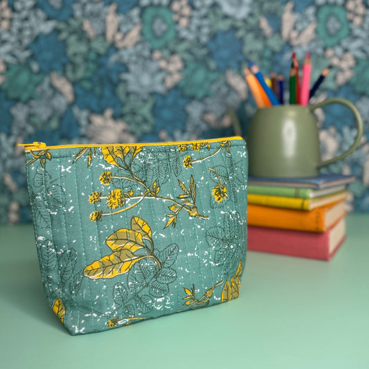 Quilted Really Useful Pouch (Teal with Golden Leaves)
