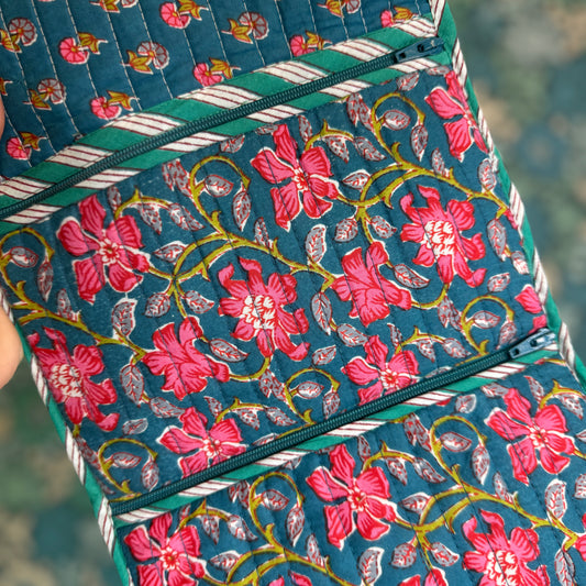 Quilted Everyday Zipped Pouch (Blue with Pink Flowers & Blue Lining)