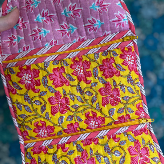 Quilted Really Useful Pouch (Yellow with Pink Flowers)