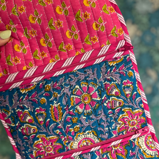 Quilted Everyday Zipped Pouch (Blue with Pink Flowers & Pink Lining)