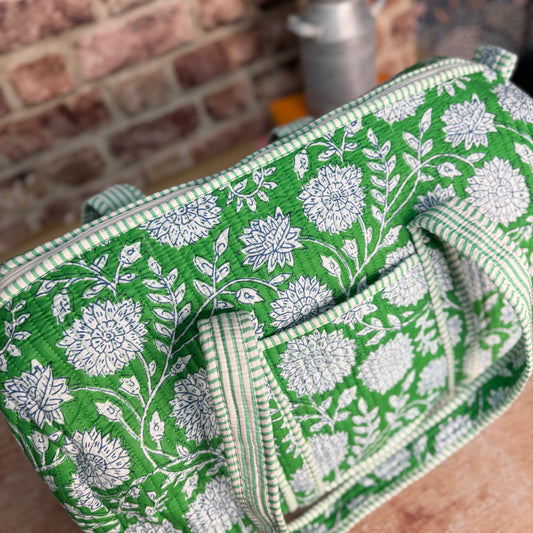Quilted Really Useful Pouch (Green with Pink Flowers & Striped Lining)