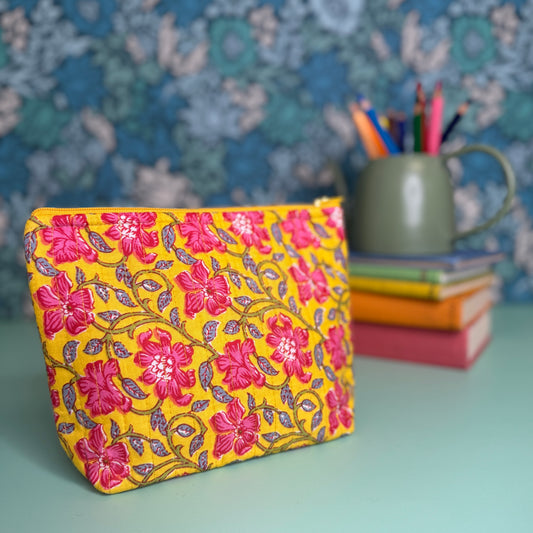 Quilted Everyday Zipped Pouch (Yellow with Pink Flowers)