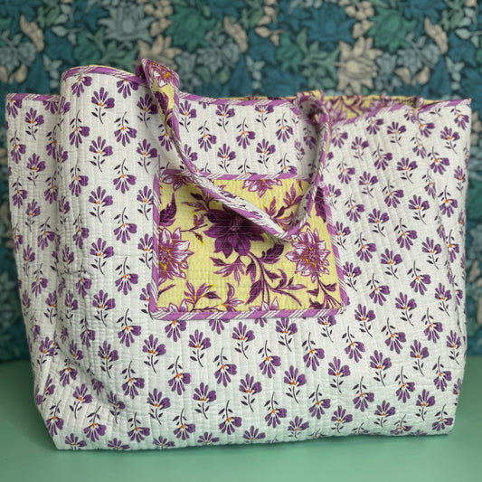 Large Reversible Quilted Tote Bag (Cream with Purple Flowers)