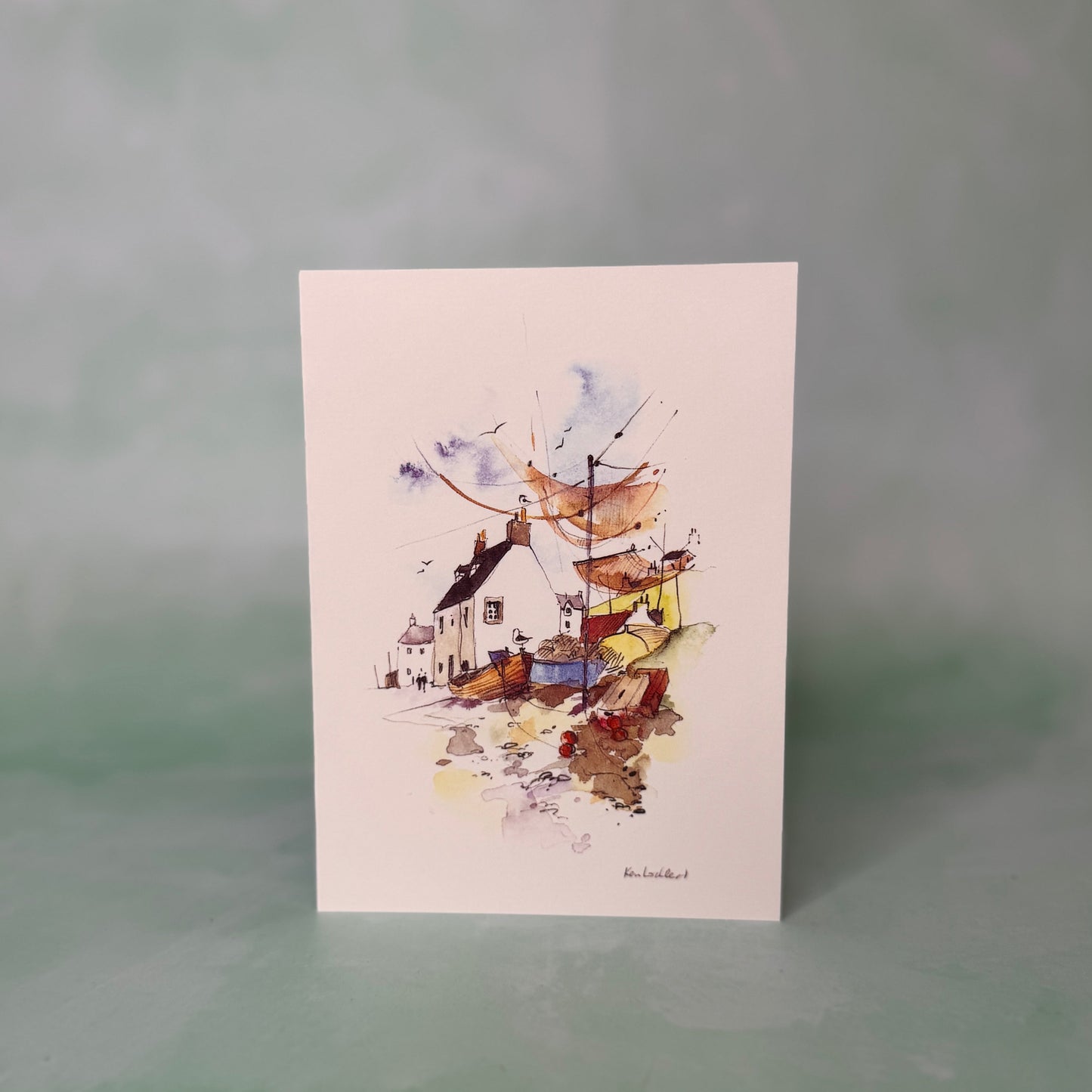 Throughout his life, dad produced a vast array of greetings cards, limited edition prints, and pictorial maps. He loved painting the West Coast of Scotland, the fishing villages of Fife, and East Lothian. Influences on his work included Chinese and Japanese art, and artists such as Turner, Mactaggart, Rowland Hilder, and the Scottish Colourists, including Joan Eardley. He regularly exhibited his work across Scotland and was a beloved tutor to many art groups.