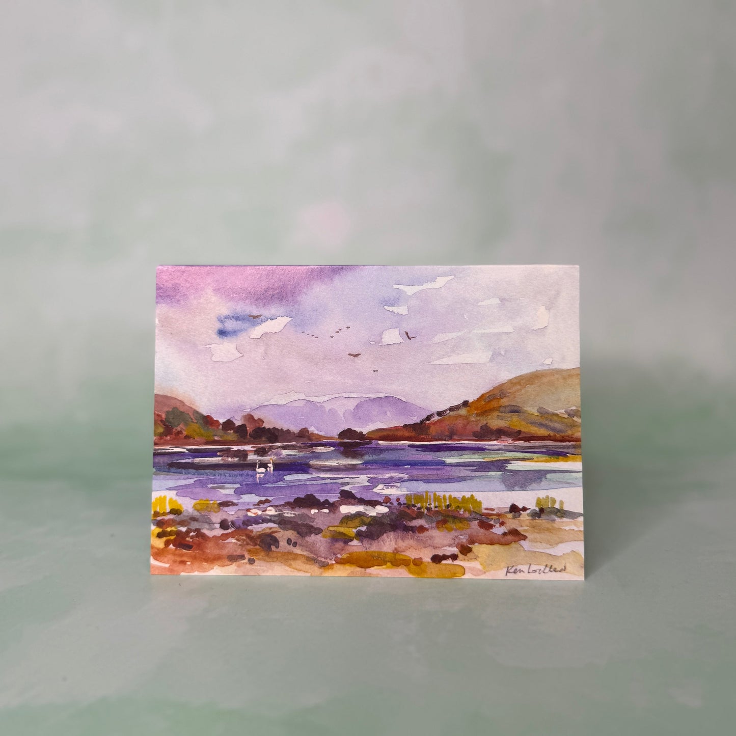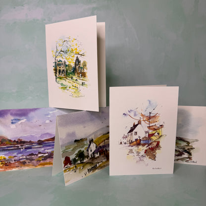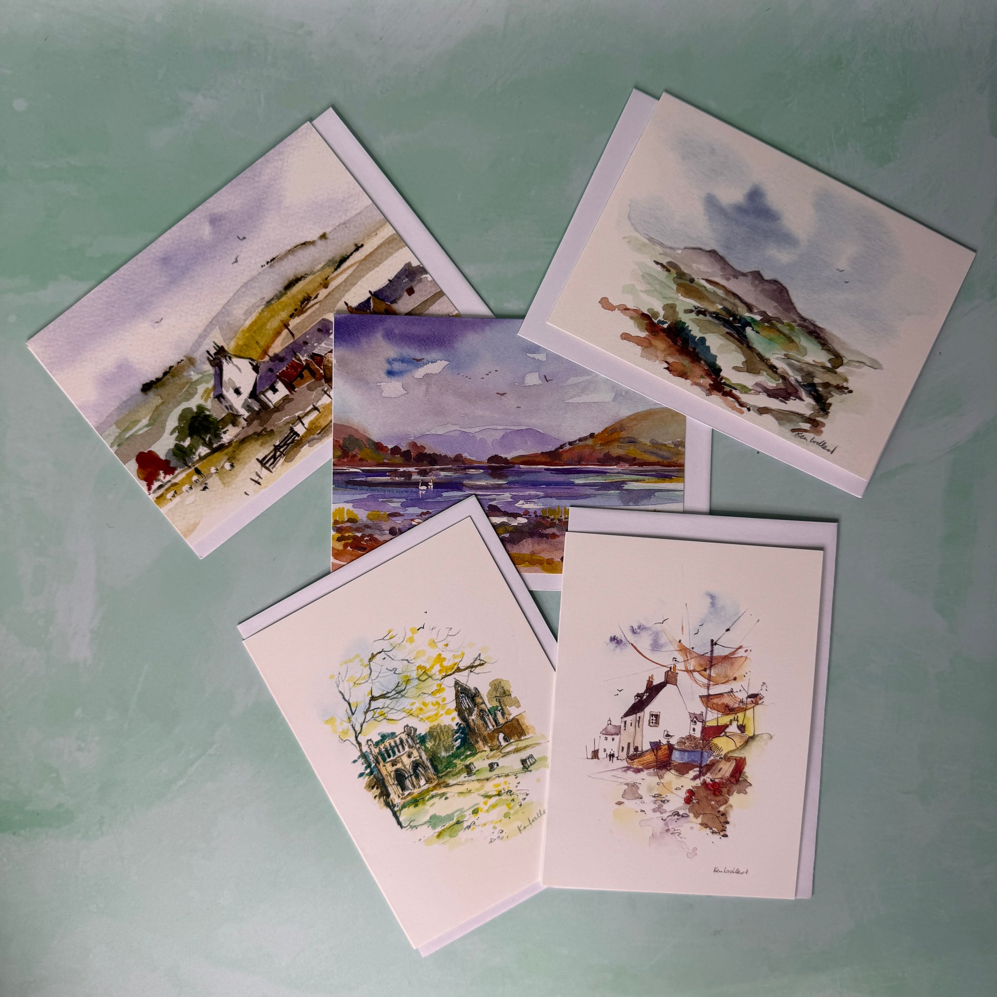 Each pack of Ken Lochhead's cards features five stunning C6-sized (114mm x 162mm) prints of his beautiful watercolour paintings, showcasing the breathtaking landscapes and scenes of Scotland. With a variety of designs in both portrait and landscape formats, these cards celebrate Scotland’s natural beauty and cultural heritage. Perfect for sending thoughtful messages or framing as mini artworks, each pack contains one of each unique design from the set, making them a wonderful gift for art and nature lovers alike.