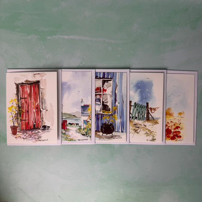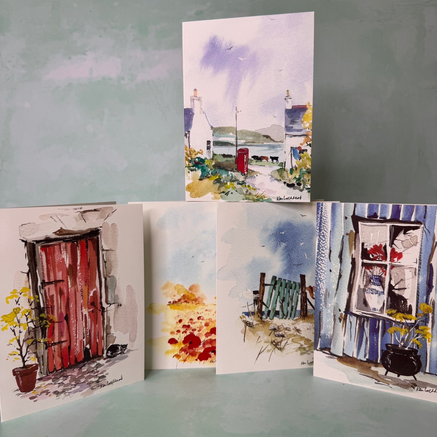Each pack of Ken Lochhead's cards features five stunning C6-sized (114mm x 162mm) prints of his beautiful watercolour paintings, showcasing the breathtaking landscapes and scenes of Scotland. With a variety of designs in both portrait and landscape formats, these cards celebrate Scotland’s natural beauty and cultural heritage. Perfect for sending thoughtful messages or framing as mini artworks, each pack contains one of each unique design from the set, making them a wonderful gift for art and nature lovers alike.