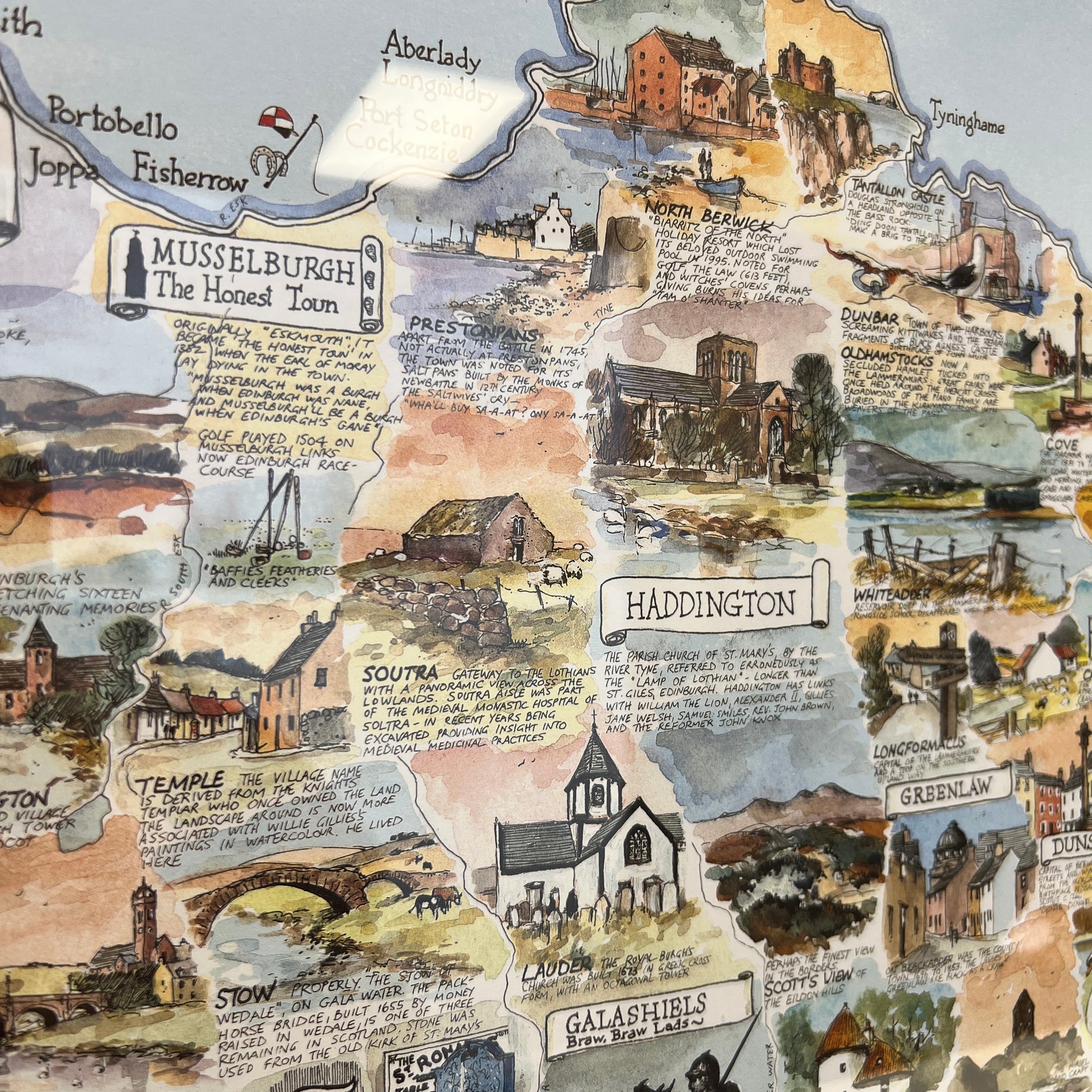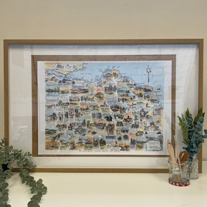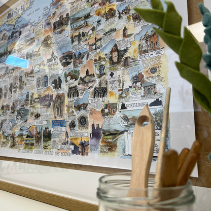 Immerse yourself in the beauty and history of The Borders with this detailed pictorial map by Ken. This artwork vividly captures the essence of the region, showcasing landmarks like the stately ruins of Melrose Abbey, the charming streets of Peebles, and the historic town of Haddington. Ken's exceptional attention to detail and rich colours bring each location to life, making this map a perfect piece for any home. This map is more than just a decorative item; it's a celebration of The Borders' deep heritage and stunning landscapes. Enhance your living space with this unique and captivating piece of art.
