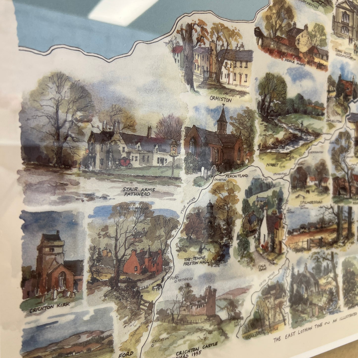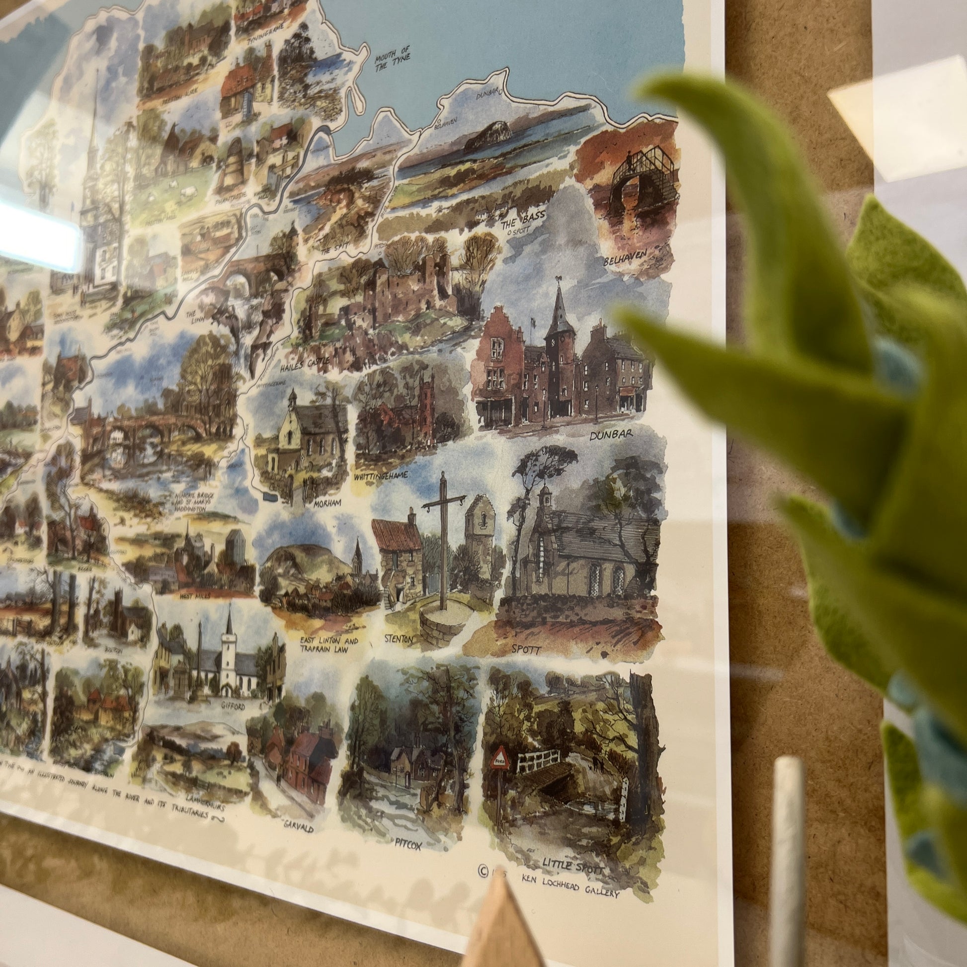 Experience the charm and beauty of East Lothian with this beautifully drawn and painted pictorial map by Ken. This high quality print captures the essence of the region, featuring detailed illustrations of iconic landmarks and picturesque scenes. From the historic Town House in Haddington to the serene fishing villages and rolling landscapes, Ken's meticulous attention to detail and use of vivid colours bring each location to life. Perfect for framing, this map not only serves as a stunning decorative piece but also as a tribute to the unique character and heritage of East Lothian.