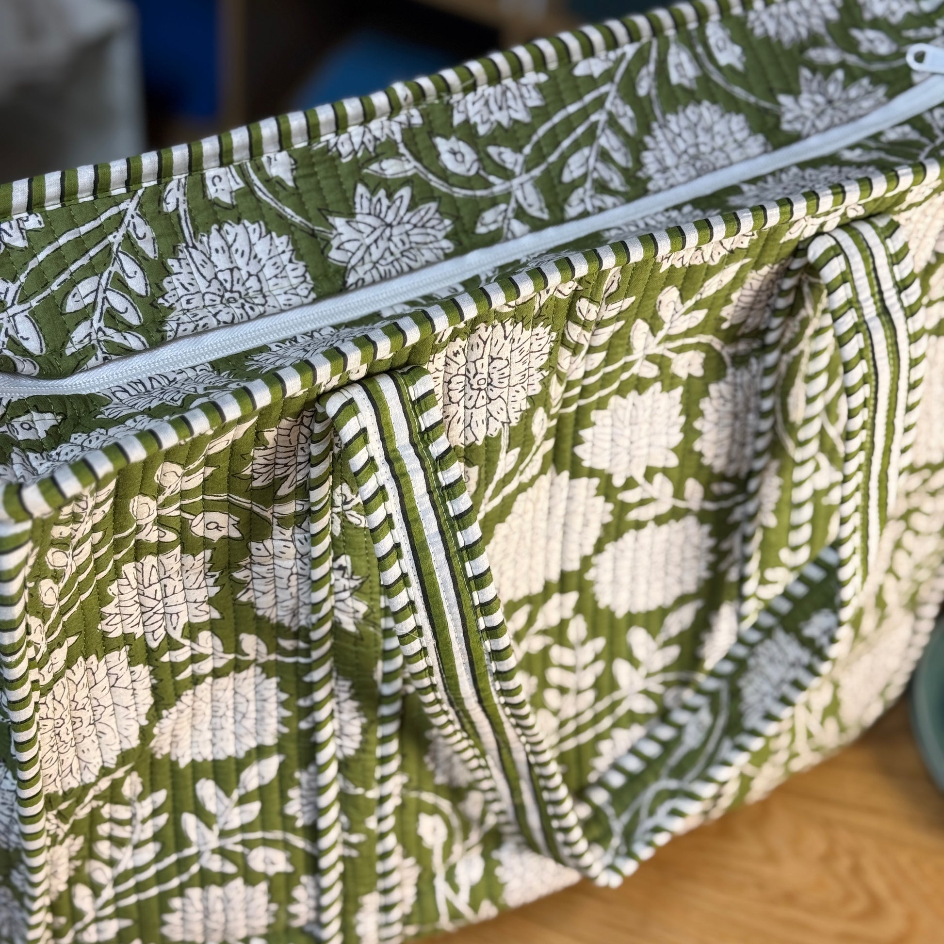 Large Quilted Tote Bag with Zip (green with white flowers)