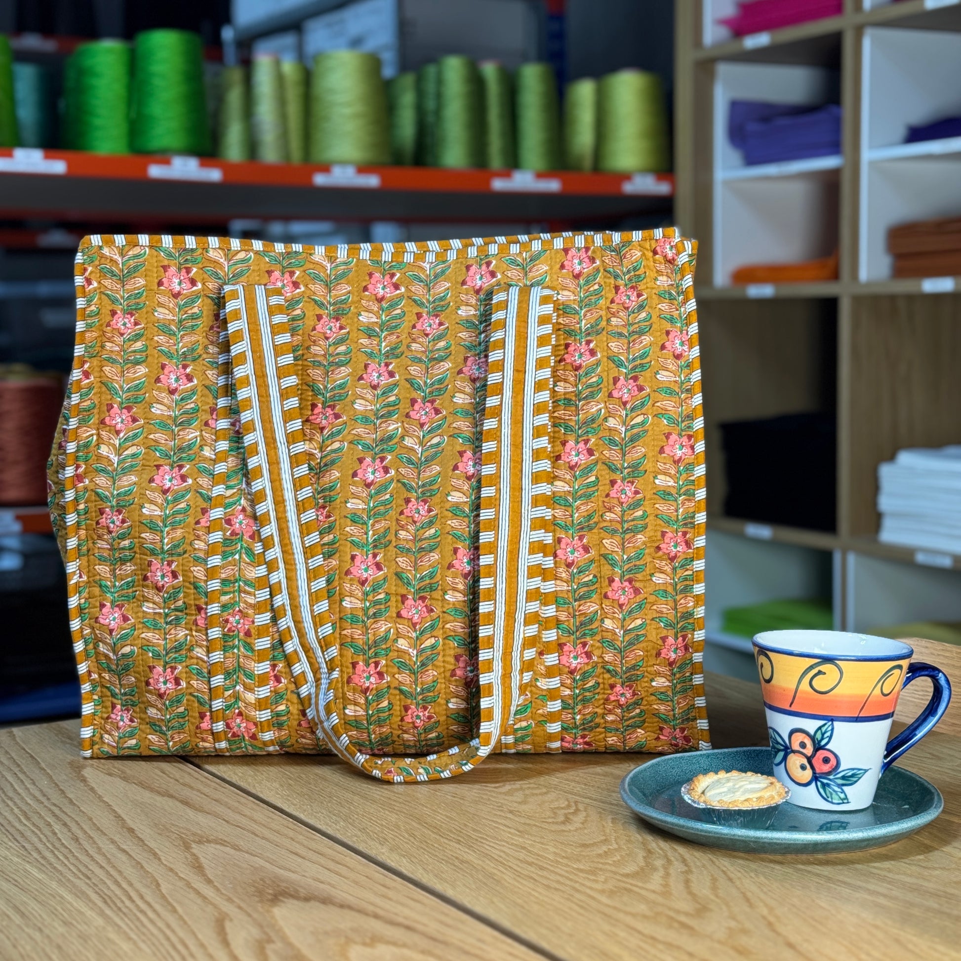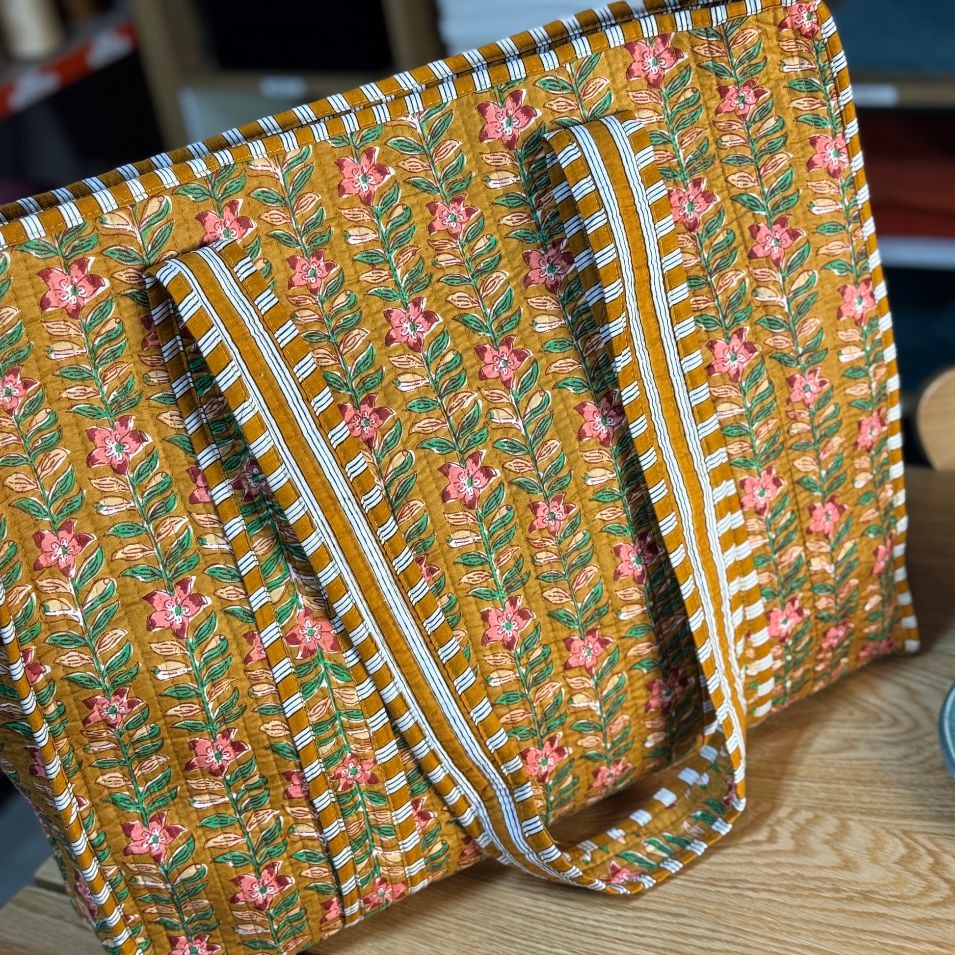 Large Reversible Quilted Tote Bag (dark yellow with pink flowers)