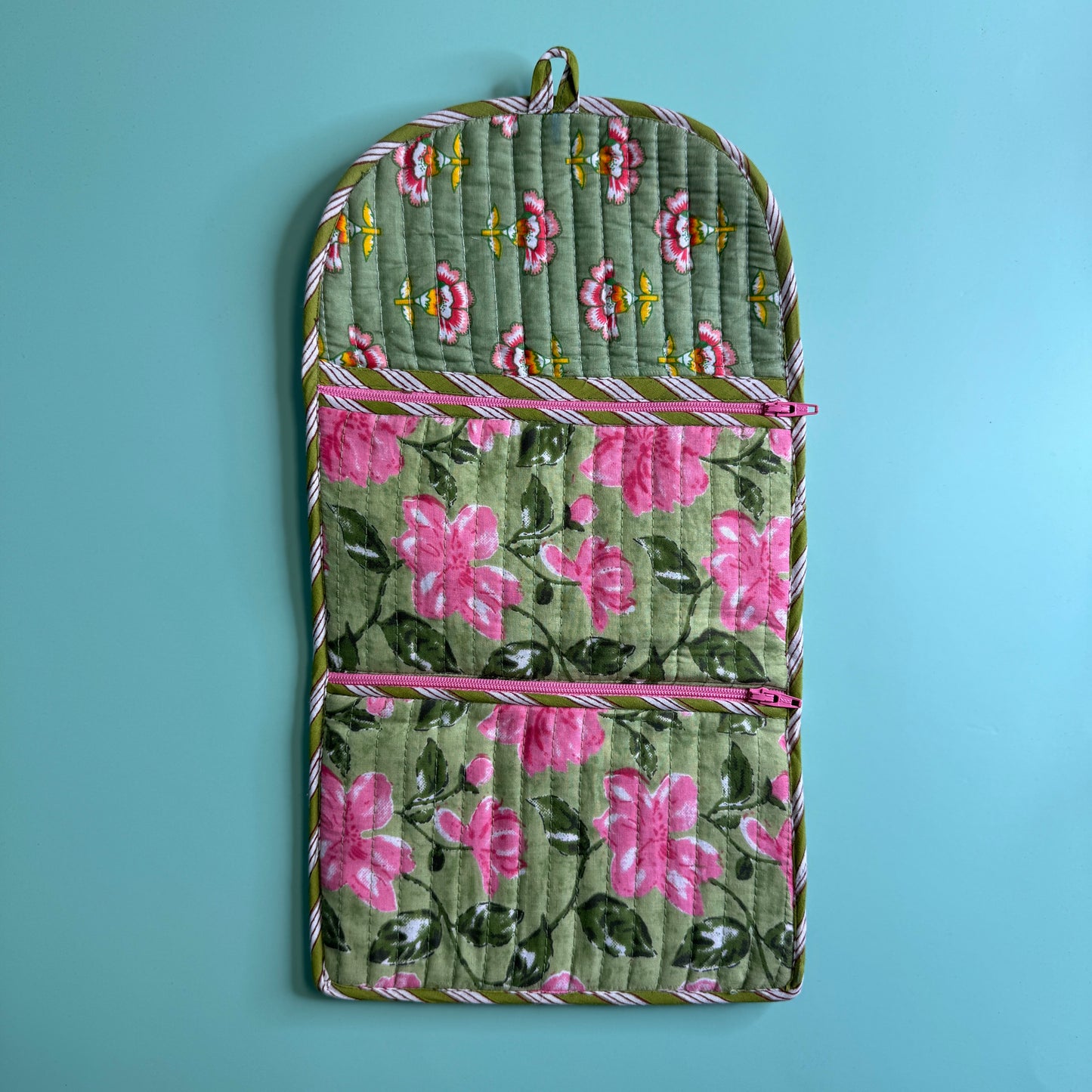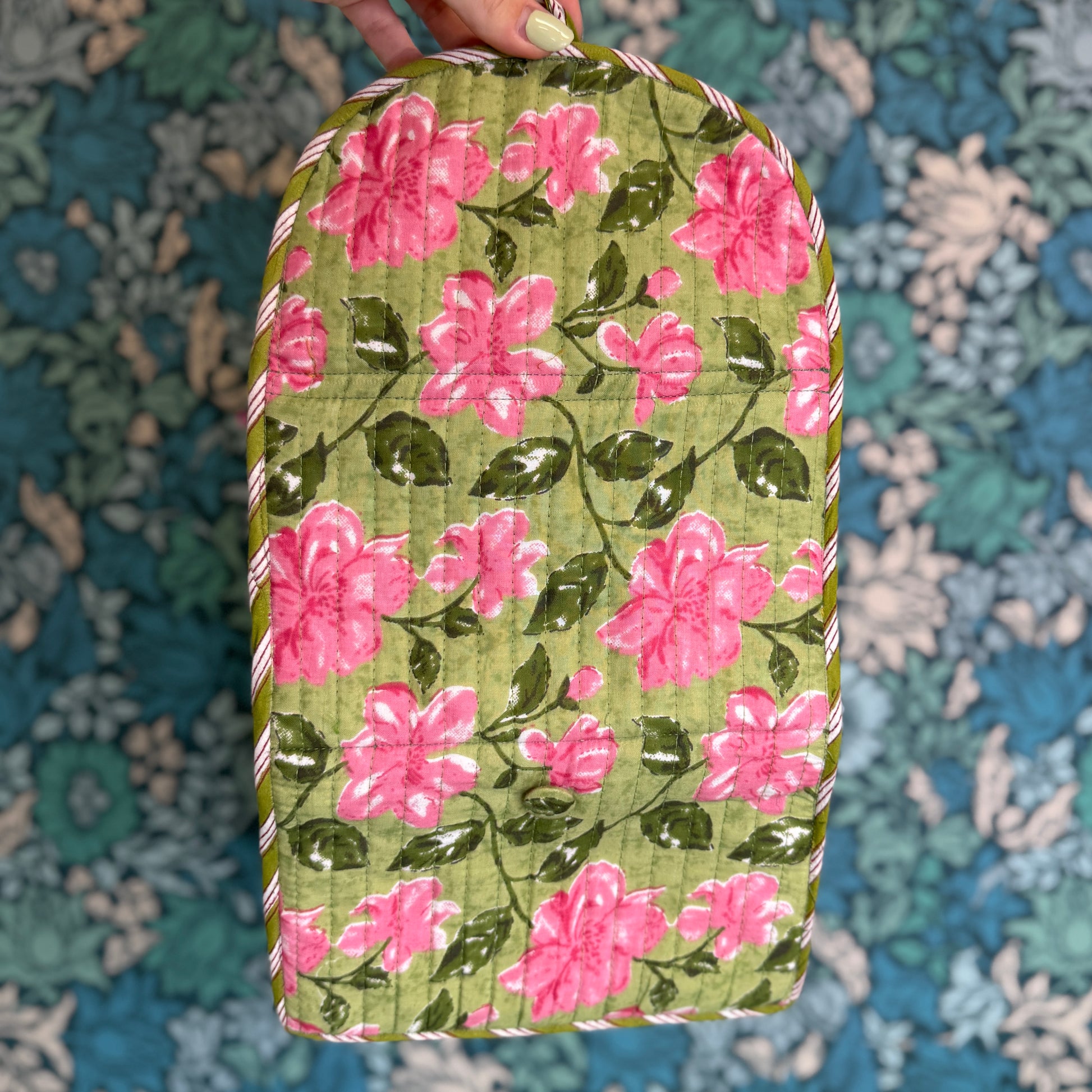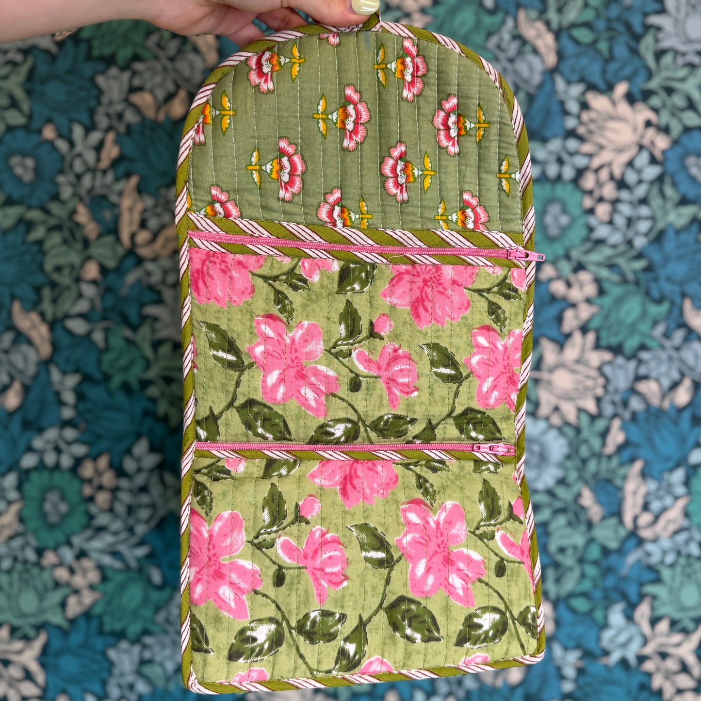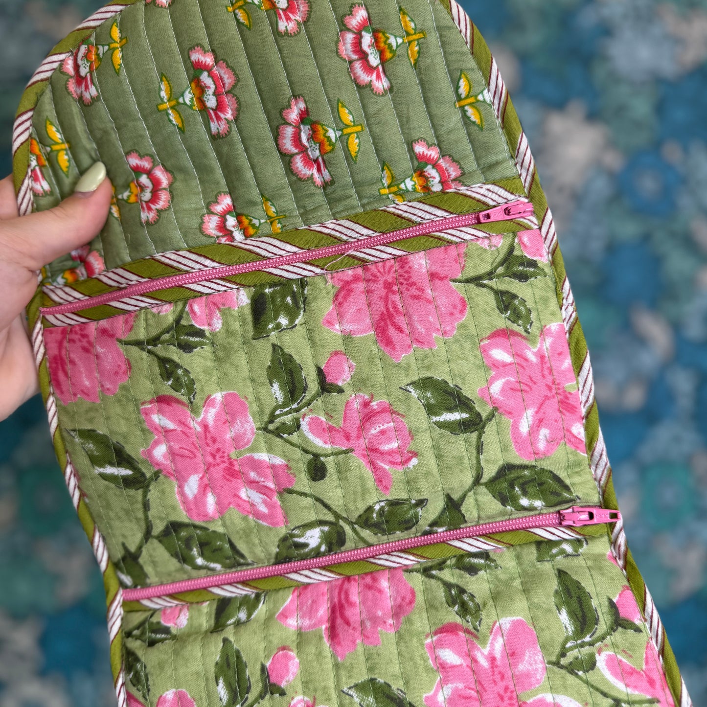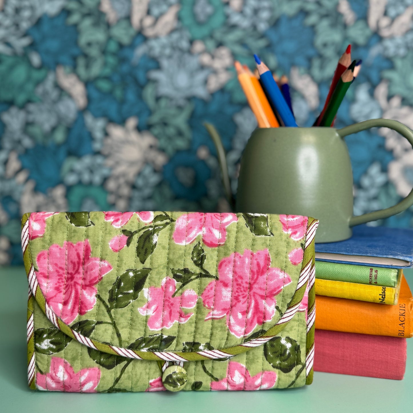 Quilted Really Useful Pouch (Light Green with Pink Flowers & Pink Floral Lining)