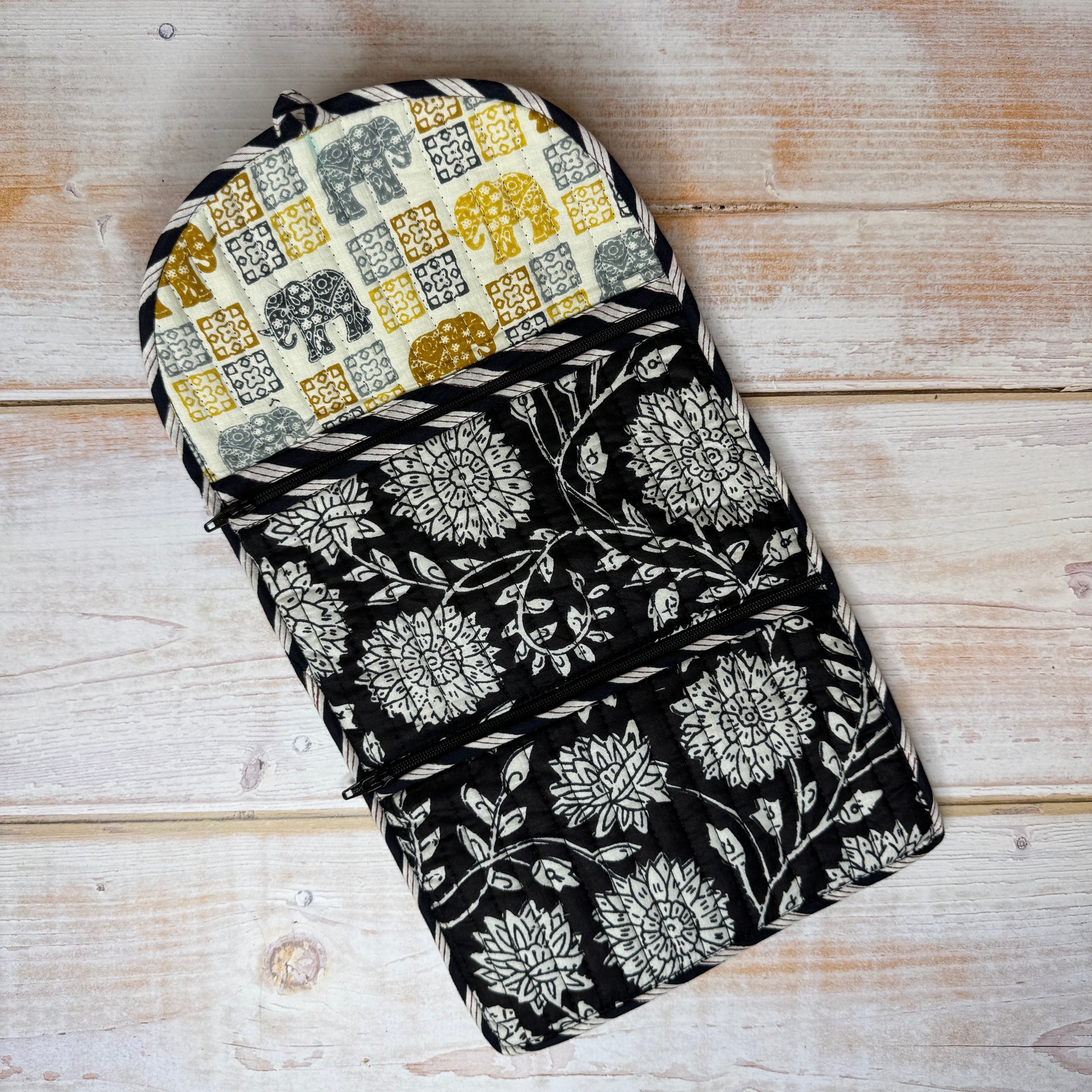 These lovely quilted really useful pouches with zips are hand made in Rajasthan and can be used as make up bags, craft bags, pencil cases etc.